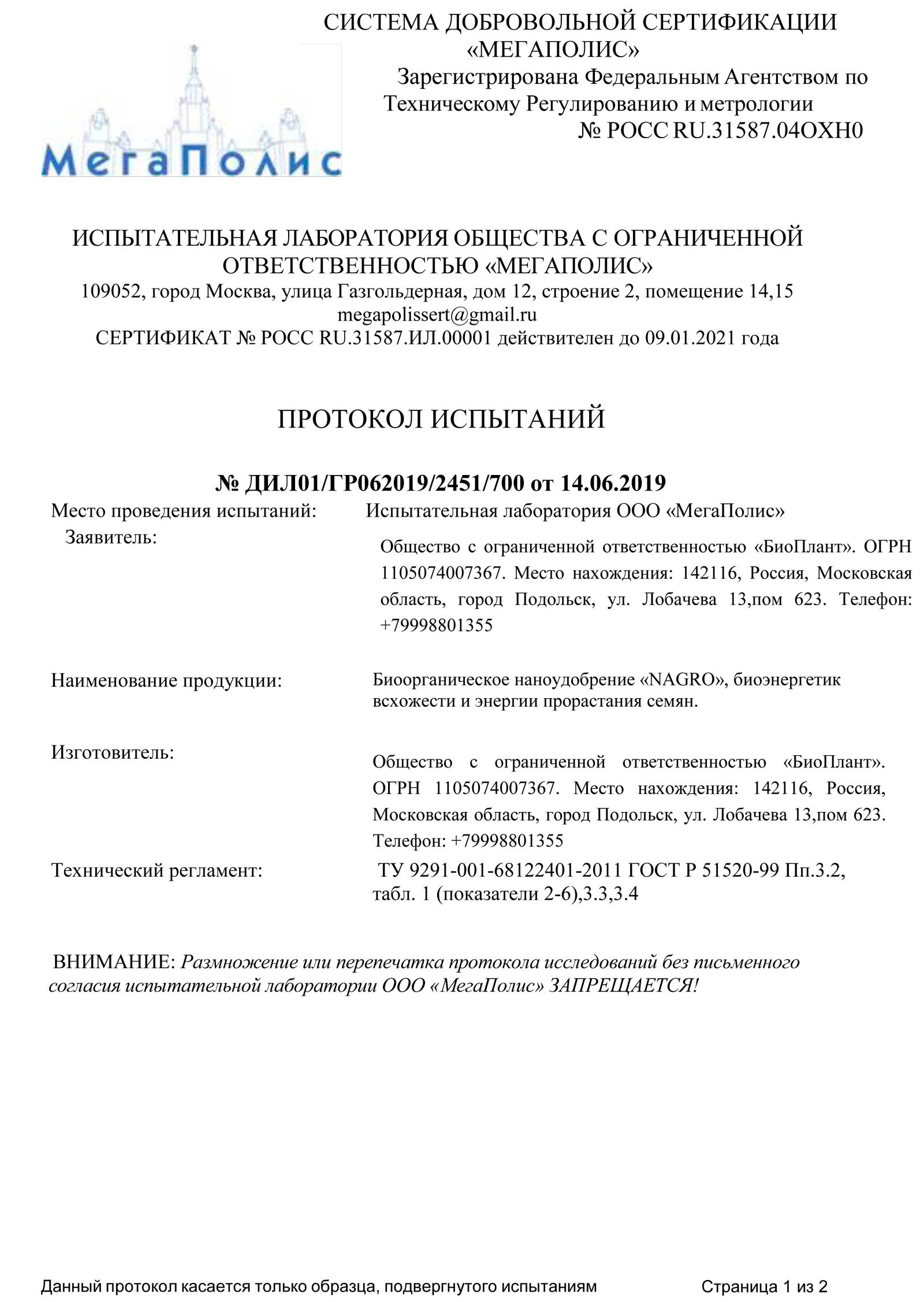 ПРОТОКОЛ ИСПЫТАНИЙ Nagro, Лариксин, Альбит, Контроль.